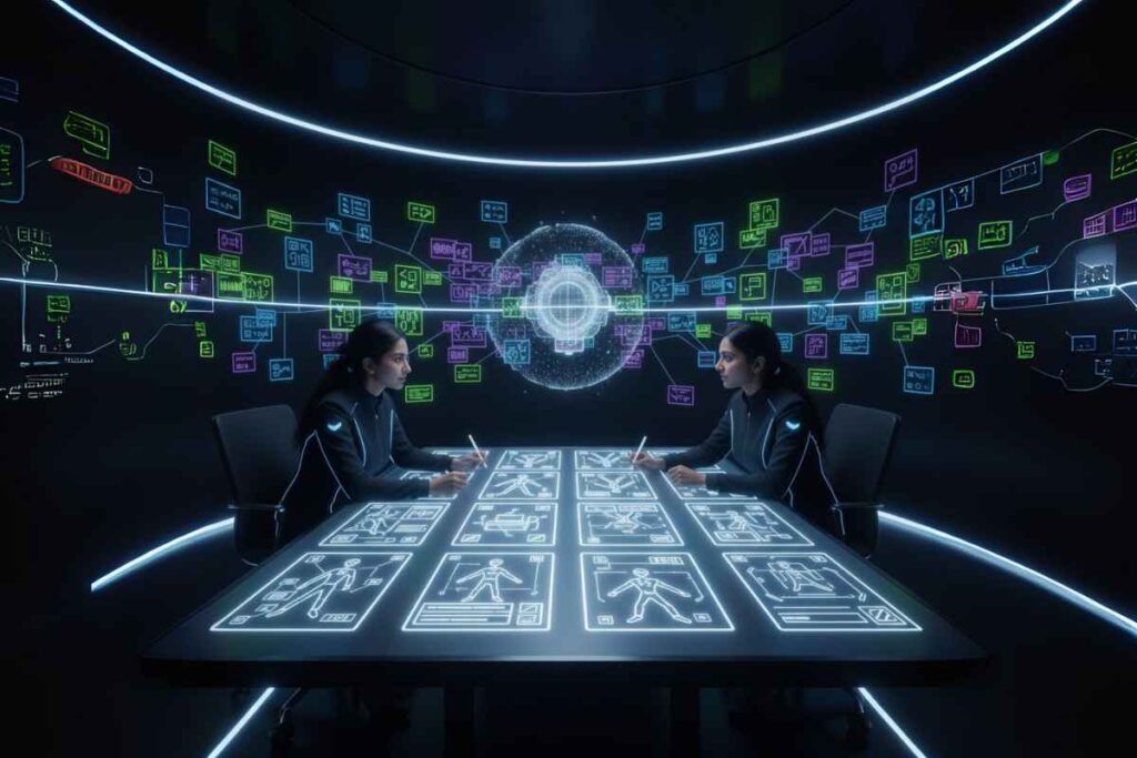 Now we take the top ideas and start fleshing out how they fit together in the user journey. We literally sketch a storyboard or user journey map: “A new employee logs in… what do they see first? Then what?” Perhaps the storyboard goes: Login -> Personalized dashboard (idea from cluster: show their role-based learning path) -> they take a first course (feature: interactive video player with quizzes) -> they have a question and go to community forum (feature: discussion board) -> system recommends next activity (feature: AI recommendation engine) -> manager gets notified of their progress (feature: manager dashboard). By visualizing the flow, we ensure the ideas integrate into a coherent product. We identify touchpoints, roles (learner, manager, admin) and how each interacts.
