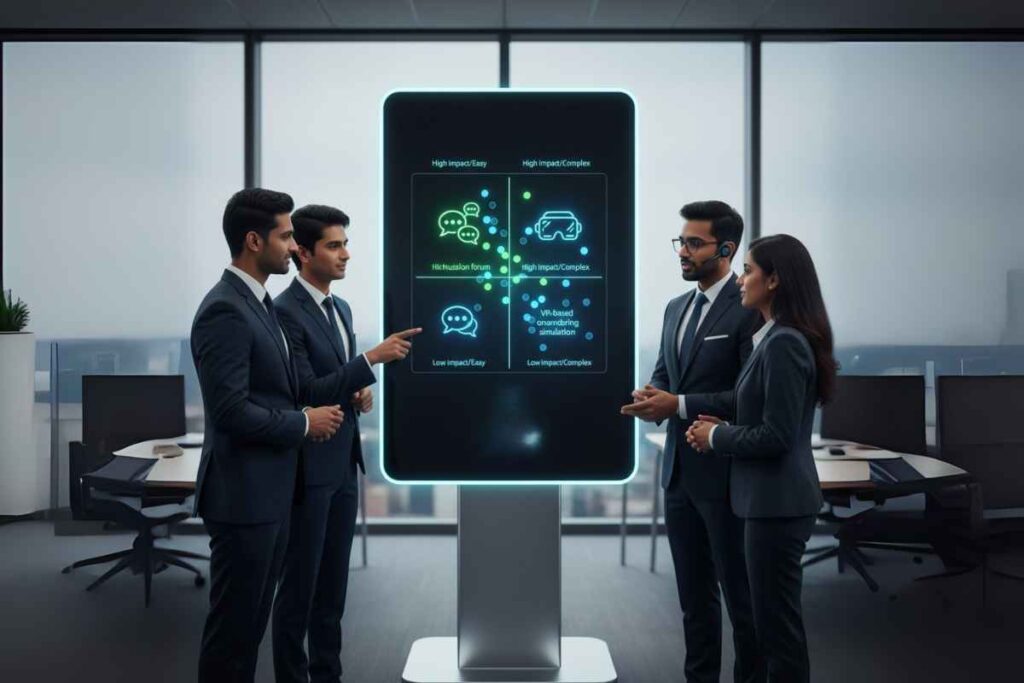 To systematically evaluate, we use a simple Impact/Feasibility matrix or dot voting. Each participant gets some dot stickers (or virtual dots) to vote on the ideas they believe are highest impact for the learners or the business. We also weigh feasibility – our technical experts will comment if something is straightforward vs cutting-edge (not to shut it down, but to mark it as maybe a longer-term item). This results in a rough sense of low-hanging fruit (high impact, easier to do) versus big bets (high impact, but might be complex or expensive). For instance, implementing a discussion forum might be high impact and relatively easy (we have a component for it), whereas “VR-based onboarding simulation” might be high impact but much more complex. The group sees these distinctions and can decide accordingly.